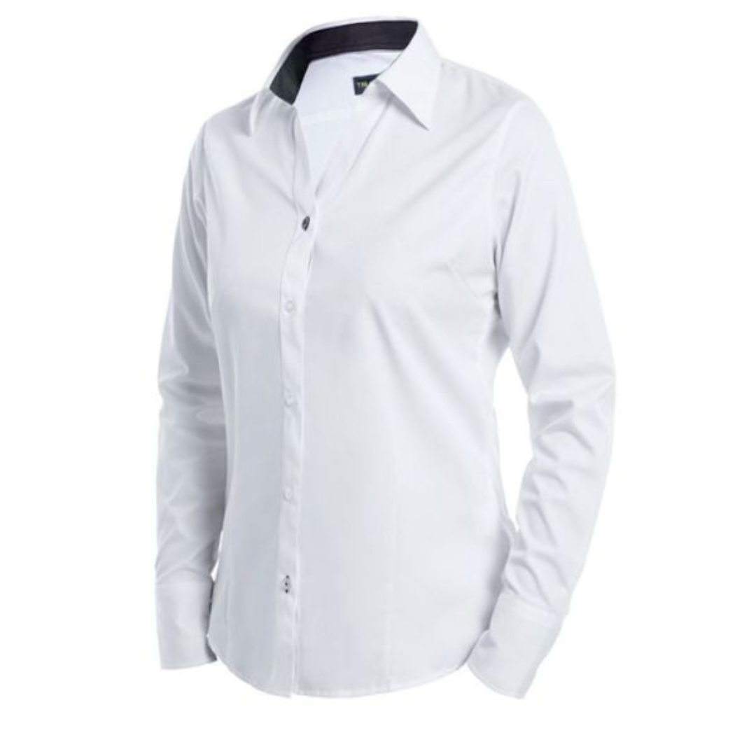 The Ladies Long Sleeve Blouse is crafted from 100% premium cotton, combining comfort with a refined finish. Designed with an open V neckline and shaped side panels, it offers a flattering, fitted silhouette. The buttoned front fastening ensures ease of wear, while the in-set long sleeves are complemented by adjustable cuffs for practicality. Finished with chic grey contrast detailing on the collar and cuffs, along with a stylish slightly curved hem, this blouse delivers both elegance and versatility for smart and casual settings.