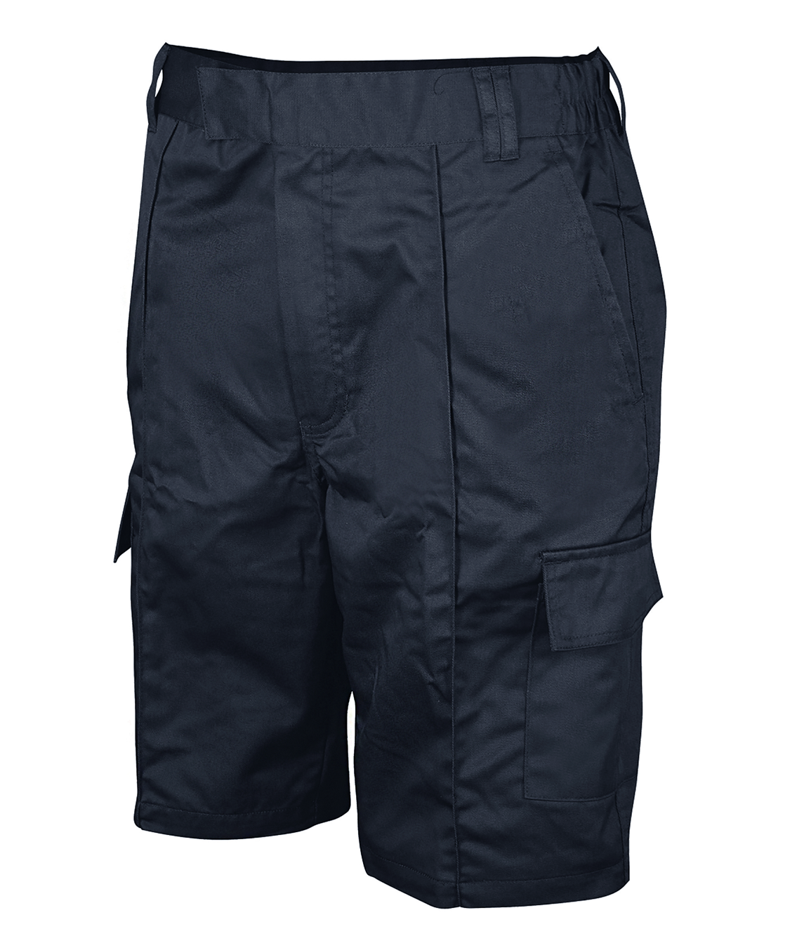 Work combat shorts with front zip & fly fastening. Hook & eye fastening on waistband extension. Elasticated on both sides of the waistband and 7 belt loops. Triple stitching on the front rise, back rise and inside legs. Pockets: 2 slanted hip pockets, 2 side leg pockets with velcro pocket flaps, 2 rear pockets with velcro pocket flaps. Front pintucks down the centre of both legs.