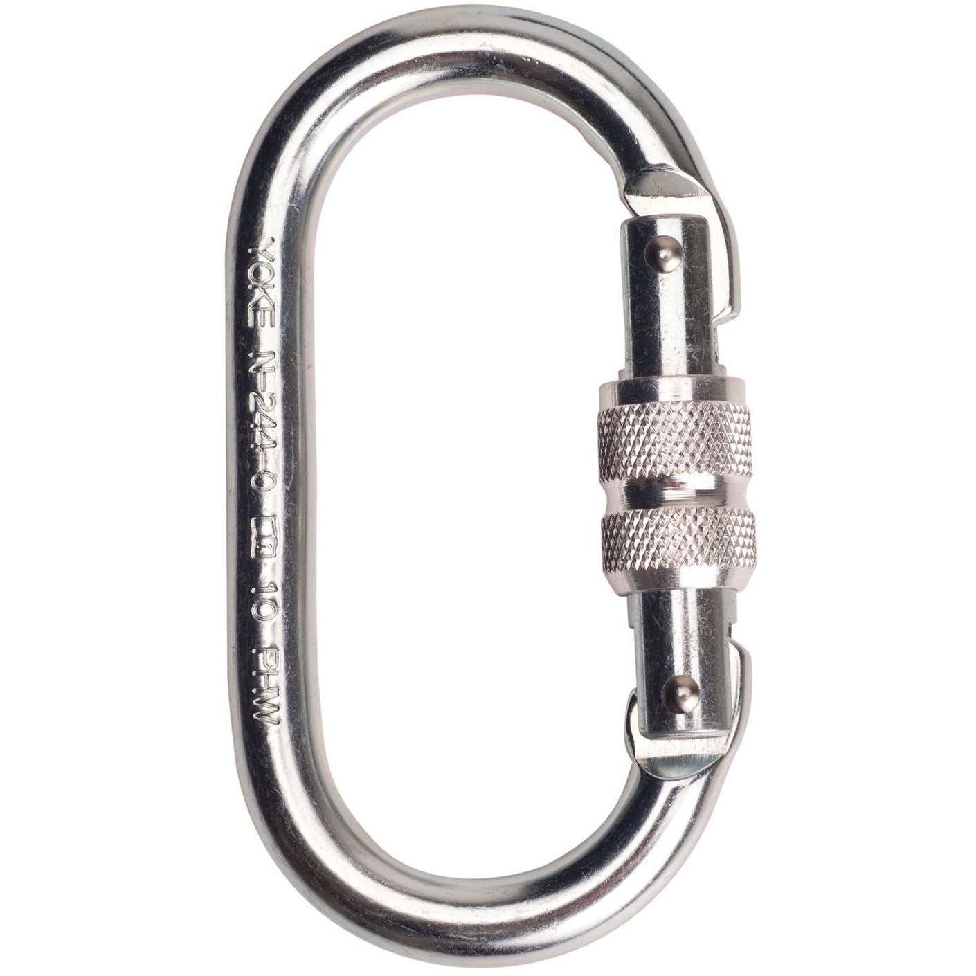 Steel oval carabiner with screw lock, length: 106mm, opening: 19mm. Breaking load: 25kN.